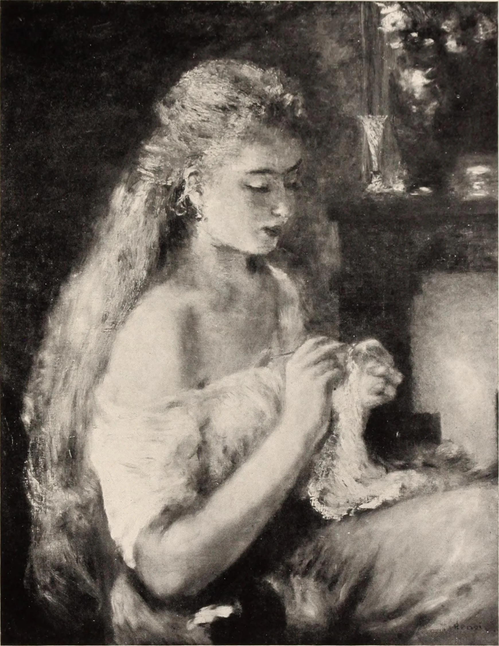 “Girl Knitting,” by Pierre-Auguste Renoir (c. 1875), public domain work; image uploaded to Wikimedia Commons under “no known copyright restrictions” (original source: Flickr — Internet Archive Book Images).
